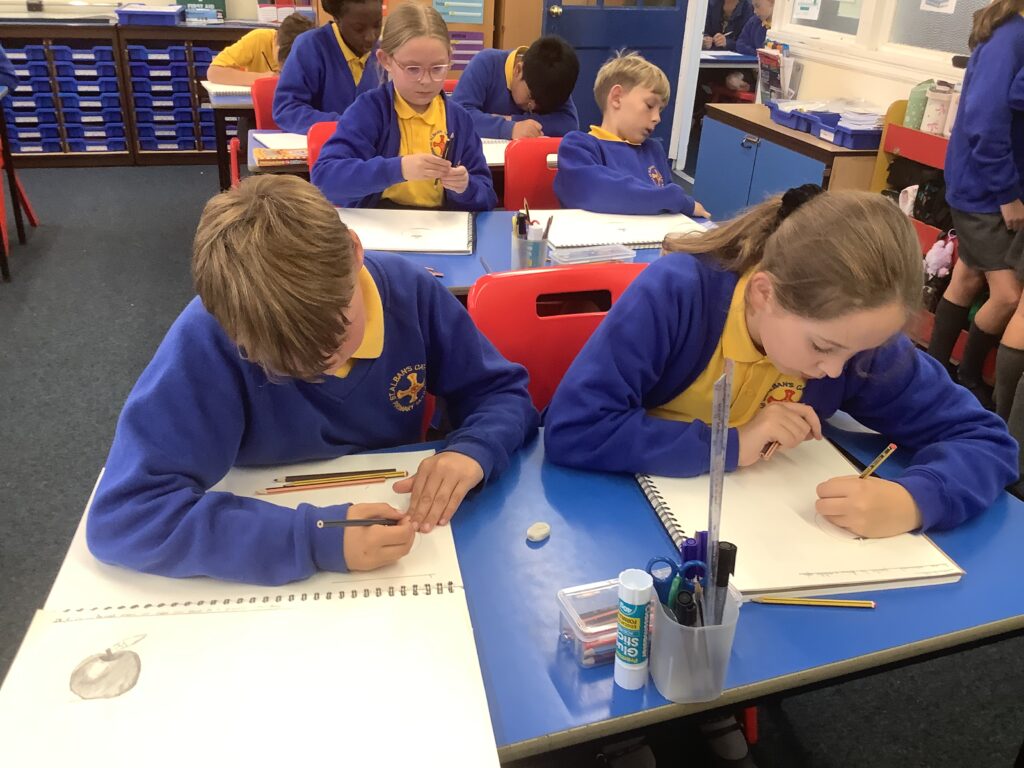 Children in Year 6 have very carefully been using different media to sketch and draw apples. Here they showcase some that they completed using coloured pencils. Aren’t they fabulous!